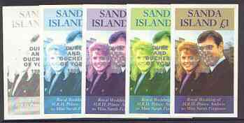 Sanda Island 1986 Royal Wedding imperf souvenir sheet (£1 value) opt'd Duke & Duchess of York in silver, the set of 5 progressive proofs, comprising single colour, 2-colour, two x 3-colour combinations plus completed design, each ……Details Below