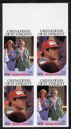 St Vincent - Grenadines 1986 Royal Wedding 60c in unmounted mint imperf proof block of 4 (2 se-tenant pairs) without staple holes in margin and therefore not from booklets