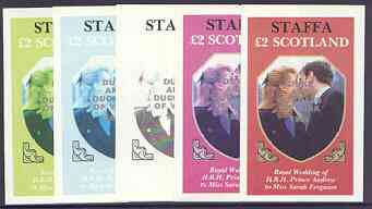 Staffa 1986 Royal Wedding imperf deluxe sheet (£2 value) opt'd Duke & Duchess of York in silver, the set of 5 progressive proofs, comprising single colour, 2-colour, two x 3-colour combinations plus completed design, all with opt.……Details Below