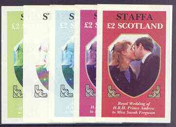 Staffa 1986 Royal Wedding imperf deluxe sheet (£2 value) the set of 5 progressive proofs, comprising single colour, 2-colour, two x 3-colour combinations plus completed design (5 proofs) unmounted mint