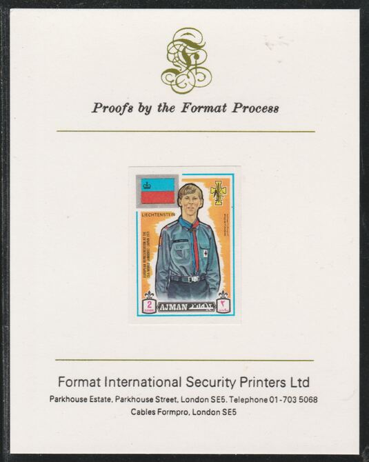 Ajman 1971 World Scouts - Liechtenstein 2Dh imperf mounted on Format International proof card as Mi 905B