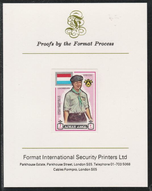 Ajman 1971 World Scouts - Luxemburg 7Dh imperf mounted on Format International proof card as Mi 908B