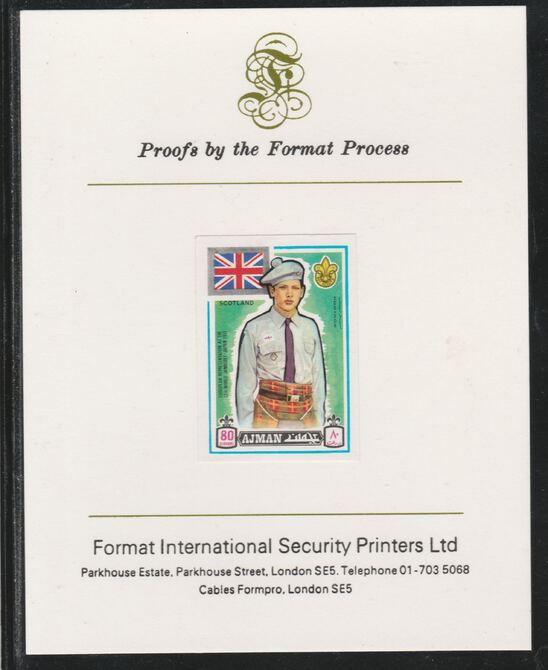 Ajman 1971 World Scouts - Scotland 80Dh imperf mounted on Format International proof card as Mi 919B