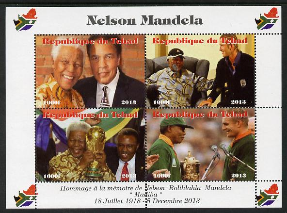 Chad 2013 Nelson Mandela #2 perf sheetlet containing four values unmounted mint. Note this item is privately produced and is offered purely on its thematic appeal. with Map shaped Flag of South Africa in border