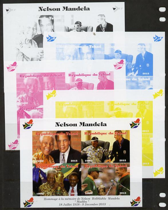 Chad 2013 Nelson Mandela #2 sheetlet containing four values - the set of 5 imperf progressive colour proofs comprising the 4 basic colours plus all 4-colour composite unmounted mint. with Map shaped Flag of South Africa in border