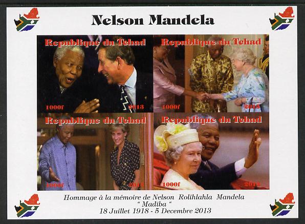 Chad 2013 Nelson Mandela #3 imperf sheetlet containing four values unmounted mint. Note this item is privately produced and is offered purely on its thematic appeal. with Map shaped Flag of South Africa in border