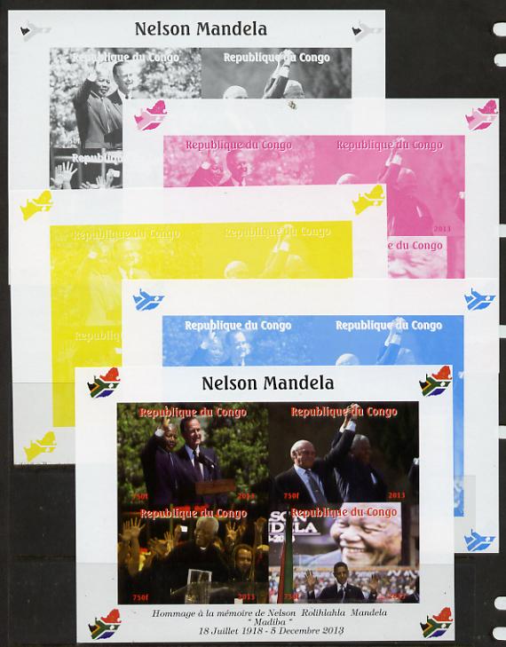 Congo 2013 Nelson Mandela #2 sheetlet containing four values - the set of 5 imperf progressive colour proofs comprising the 4 basic colours plus all 4-colour composite unmounted mint with Map shaped Flag of South Africa in border