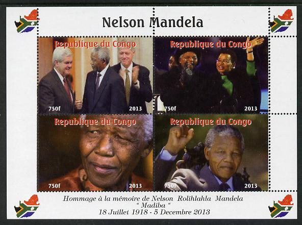 Congo 2013 Nelson Mandela #3 perf sheetlet containing four values unmounted mint. Note this item is privately produced and is offered purely on its thematic appeal with Map shaped Flag of South Africa in border