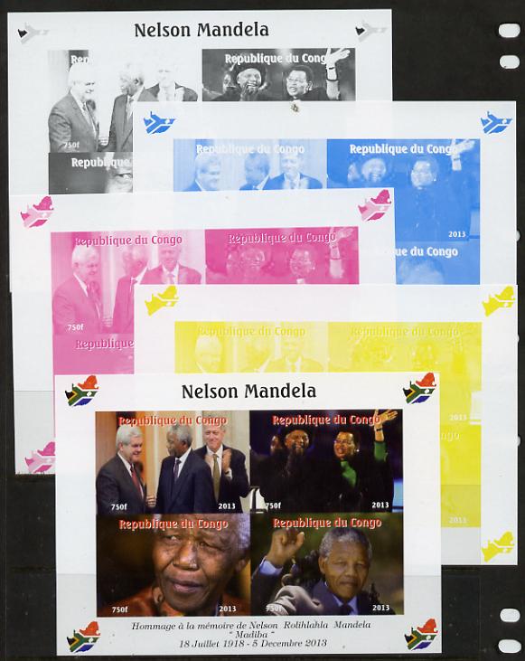 Congo 2013 Nelson Mandela #3 sheetlet containing four values - the set of 5 imperf progressive colour proofs comprising the 4 basic colours plus all 4-colour composite unmounted mint with Map shaped Flag of South Africa in border
