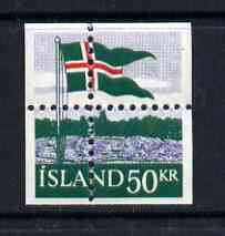 Iceland 1958 40th Anniversary of Flag 50k with misplaced perfs such that stamp is quartered, being a 'Hialeah' forgery on gummed paper (as SG 359)