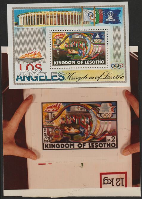 Lesotho 1984 Los Angeles Olympic Games coloured photograph of essay for 2m value showing Flames & Flags (as used for m/sheet)with official label on reverse giving technical details with alterations to value and size complete with issued m/sheet SG MS595