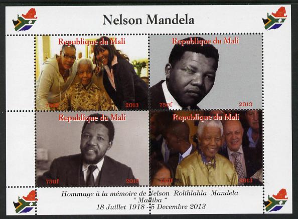 Mali 2013 Nelson Mandela #2 perf sheetlet containing four values unmounted mint. Note this item is privately produced and is offered purely on its thematic appeal with Map shaped Flag of South Africa in border