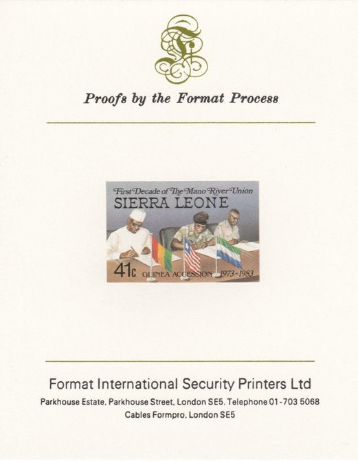 Sierra Leone 1984 Mano River 41c (Signing Ceromony) imperf proof mounted on Format International proof card as SG 786