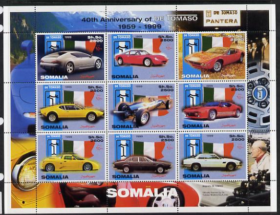Somalia 1999 40th Anniversary of De Tomaso Cars perf sheetlet containing 9 values unmounted mint. Note this item is privately produced and is offered purely on its thematic appeal