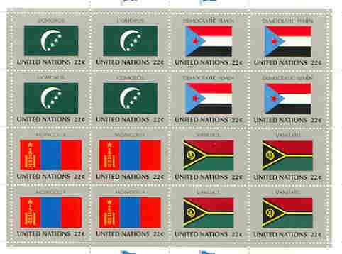 United Nations (NY) 1987 Flags of Member Nations #8 sheetlet of 16 containing flags of Comoro Is, Yemen, Mongolia & Vanuatu each in blocks of 4 unmounted mint, SG 511a