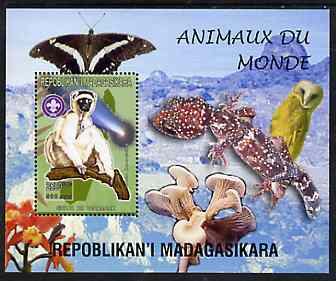 Madagascar 1999 Animals of the World #06 perf m/sheet showing Sifaka with Scout Logo, background shows Owl, Butterfly, Reptile, Fungi & Orchid, unmounted mint