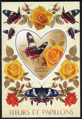 Madagascar 2014 Flowers & Butterflies #2 perf souvenir sheet containing heart shaped value unmounted mint