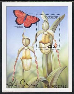 NIcaragua 2000 (?) Orchids & Butterfly perf m/sheet signed by Thomas C Wood the designer (slight imperfection at base)