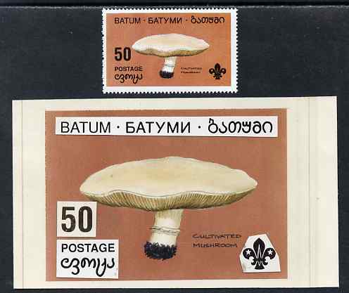 Batum 1994 Fungi - Cultivated Mushroom 50r with Scout emblem, original hand-painted atywork on card 90 mm x 65 mm with overlay plus issued stamp. Note this item is privately produced and is offered purely on its thematic appeal, i……Details Below
