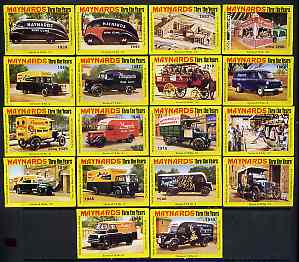 Match Box Labels - complete set of 18 Maynards Thru The Years (Mainly vehicles), superb unused condition (Cornish Match Co for Maynards)
