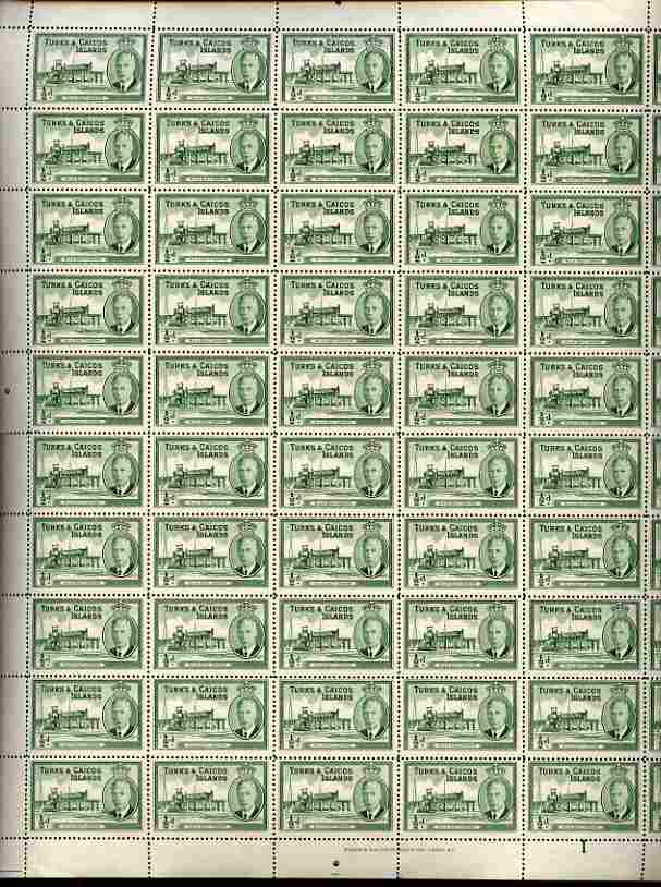 Turks & Caicos Islands 1950 KG6 Bulk Salt Loading 1/2d green in complete sheet of 60 folded but unmounted mint, SG 221