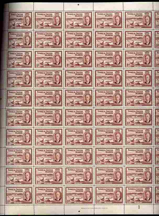 Turks & Caicos Islands 1950 KG6 Salt Cay 1d red-brown in complete sheet of 60 folded but unmounted mint, SG 222