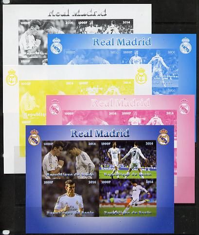 Benin 2014 Real Madrid sheetlet containing 4 values - the set of 5 imperf progressive proofs comprising the 4 individual colours plus all 4-colour composite, unmounted mint
