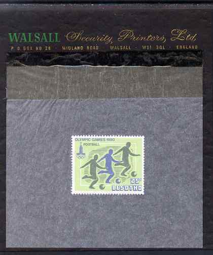 Lesotho 1980 Moscow Olympic games 25s (Football) perforated proof essay mounted on Walsall Security Proof card, rare
