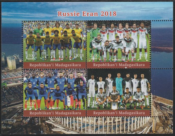 Madagascar 2018 Football World Cup - (Brazil, Germany, France & England) perf sheetlet containing 4 values unmounted mint. Note this item is privately produced and is offered purely on its thematic appeal.