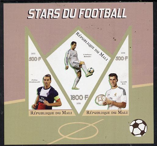 Mali 2015 Football Stars imperf sheetlet containing one diamond shaped & two triangular values unmounted mint