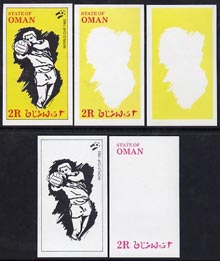 Oman 1982 Football World Cup imperf souvenir sheet (2r) set of 5 progressive colour proofs comprising the 3 individual colours, 2-colour and all 3-colour composites, unmounted mint