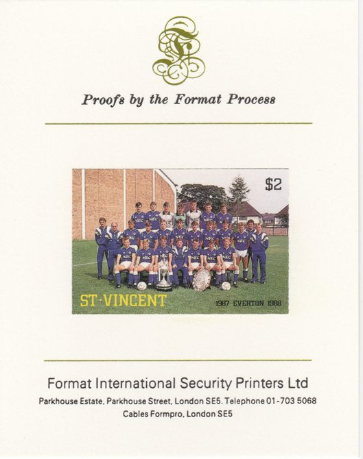 St Vincent 1987 English Football teams $2 Everton imperf mounted on Format International proof card as SG 1090