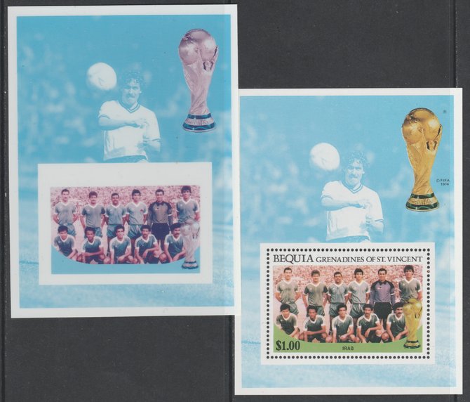 St Vincent - Bequia 1986 World Cup Football $1.00 m/sheet (Iraq Team) imperf Cromalin die proof (plastic card) in magenta & cyan only (plus issued m/sheet) ex Format International archives. Cromalin proofs are an essential part of the printing proces, produced in very limited numbers and rarely offered on the open market.