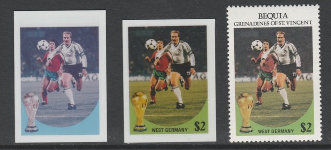 St Vincent - Bequia 1986 World Cup Football $2 West Germany - imperf Cromalin die proofs (plastic card) in magenta & cyan only and all 4 colours plus issued stamp, two rare proof items from the Format International archives. Croma……Details Below