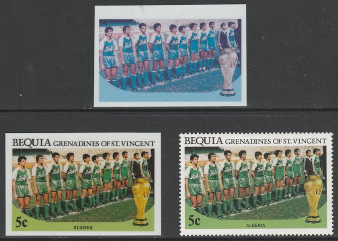 St Vincent - Bequia 1986 World Cup Football 5c Algeria Team - imperf Cromalin die proofs (plastic card) in magenta & cyan only and all 4 colours plus issued stamp, two rare proof items from the Format International archives. Cromalin proofs are an essential part of the printing proces, produced in very limited numbers and rarely offered on the open market.