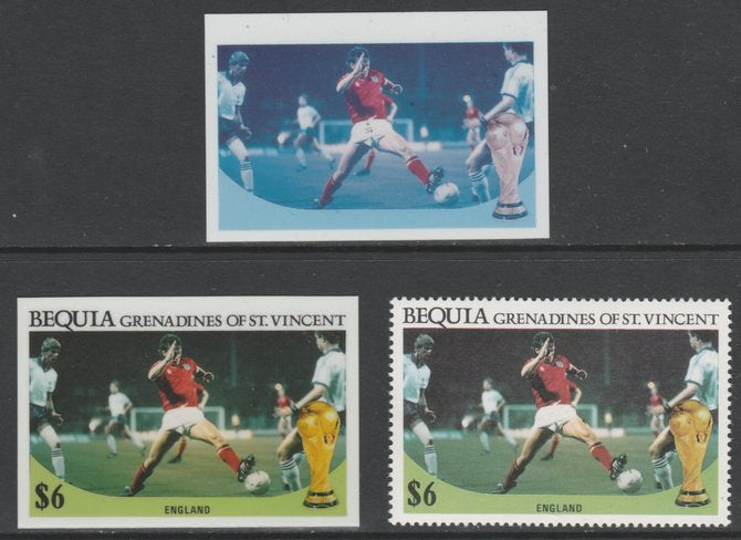 St Vincent - Bequia 1986 World Cup Football $6 England - imperf Cromalin die proofs (plastic card) in magenta & cyan only and all 4 colours plus issued stamp, two rare proof items from the Format International archives. Cromalin proofs are an essential part of the printing proces, produced in very limited numbers and rarely offered on the open market.