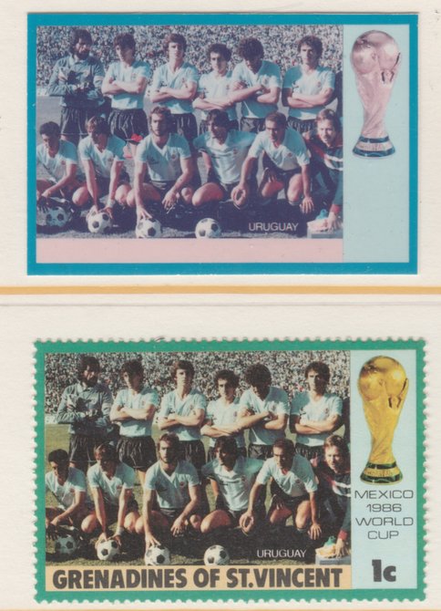 St Vincent - Grenadines 1986 World Cup Football 1c Uruguay Team - imperf Cromalin die proof (plastic card) in magenta & cyan only (plus issued stamp)rare proof item from the Format International archives. Cromalin proofs are an essential part of the printing proces, produced in very limited numbers and rarely offered on the open market.