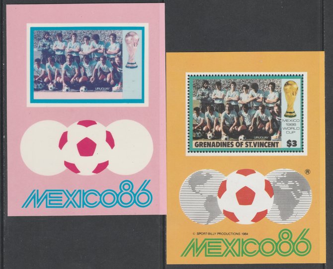St Vincent - Grenadines 1986 World Cup Football $3.00 m/sheet (Uruguay Team) imperf Cromalin die proof (plastic card) in magenta & cyan only (plus issued m/sheet) ex Format International archives. Cromalin proofs are an essential part of the printing proces, produced in very limited numbers and rarely offered on the open market.