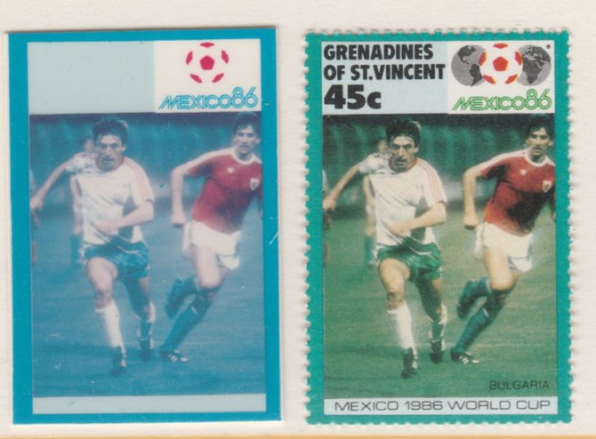 St Vincent - Grenadines 1986 World Cup Football 45c Bulgaria - imperf Cromalin die proof (plastic card) in magenta & cyan only (plus issued stamp)rare proof item from the Format International archives. Cromalin proofs are an essential part of the printing proces, produced in very limited numbers and rarely offered on the open market.