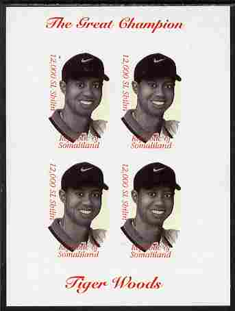Somaliland 2000 Tiger Woods (The Great Champion) imperf sheetlet containing 4 x 12,000sl values unmounted mint. Note this item is privately produced and is offered purely on its thematic appeal