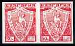 Bulgaria 1935 Gymnastics Tournament 50L (Gymnast & Lion) imperf pair being a 'Hialeah' forgery on gummed paper (as SG 362)