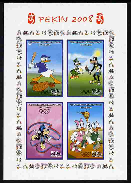 Congo 2008 Disney Beijing Olympics imperf sheetlet #2 containing 4 values (Baseball, Gymnastics & with the Torch) overprinted with Olympic Rings unmounted mint. Note this item is privately produced and is offered purely on its thematic appeal