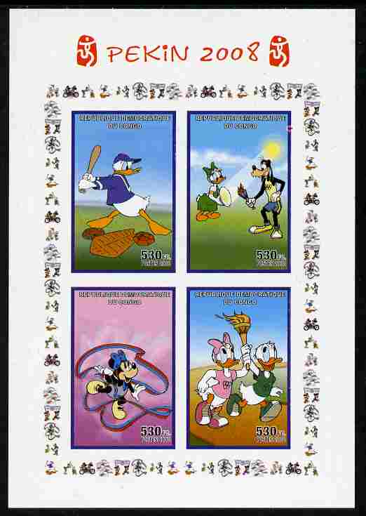 Congo 2008 Disney Beijing Olympics imperf sheetlet #2 containing 4 values (Baseball, Gymnastics & with the Torch) unmounted mint. Note this item is privately produced and is offered purely on its thematic appeal