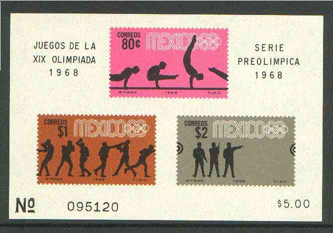 Mexico 1968 Olympic Games (4th Issue - Postage) imperf m/sheet showing Gymnastics, Boxing & Pistol shooting unmounted mint, SG MS 1164b
