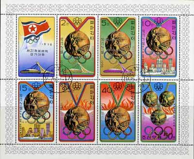 North Korea 1976 Olympic Medal Winners (1st Issue) sheetlet containing complete set of 7 plus label with winners opt'd in silver, very fine cto used, see after SG N1543