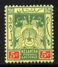 Malaya - Kelantan 1921-28 Script CA Arms 5c green & red on yellow unmounted mint SG 18