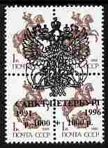 Russia 1996 (Local) 5th Anniversary of Federation overprint showing Russian Coat of Arms and inscribed St Petersburg overprinted on block of 4 Russian defs unmounted mint