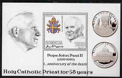 Somalia 2006 Pope John Paul II - First Anniversary of his Death perf s/sheet #4 showing Commemorative coins & Arms - Holy Catholic Priest for 58 Years, unmounted mint