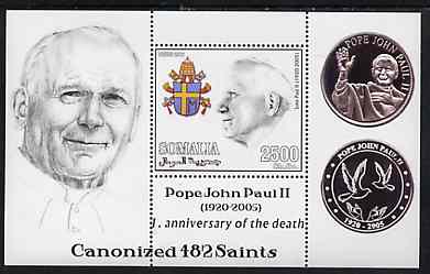 Somalia 2006 Pope John Paul II - First Anniversary of his Death perf s/sheet #6 showing Commemorative coins & Arms - Canonized 482 Saints, unmounted mint