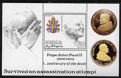 Somalia 2006 Pope John Paul II - First Anniversary of his Death perf s/sheet #8 showing Commemorative coins & Arms - Survived an Assassination Attempt, unmounted mint